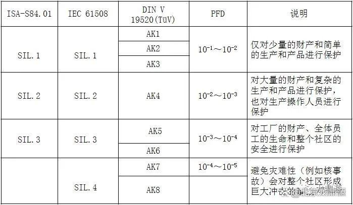 Menurut standar IEC, dibagi menjadi SIL1-SIL4 dari rendah ke tinggi, SIL1-SIL3 dari ISA 84.01, dan AK1-AI8 dari rendah ke tinggi menurut DIN V VDE0804. Hubungan yang sesuai di antara mereka adalah sebagai berikut.