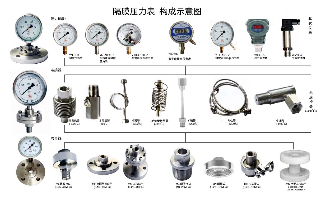◆ Aplikasi: Karena struktur pengukuran tidak langsung, pengukur tekanan diafragma cocok untuk mengukur tekanan cairan, gas atau padatan yang mengalir granular dengan viskositas tinggi, mudah dikristalisasi, korosi kuat dan suhu tinggi. Diafragma isolasi memiliki berbagai bahan untuk beradaptasi dengan berbagai media korosif yang berbeda.